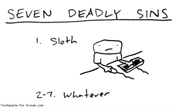 The seven cardinal sins, AKA “The Seven Deadly Sins” on most Most Wanted posters, are Pride, Greed, Lust, Anger, Gluttony, Envy, and Sloth. “Poor Sloth,” a friend once said, “always trailing behind and coming in last on the list. If only he could speed up. There is nothing Sloth can’t do once he sets his mind to it.”