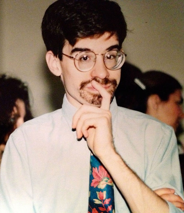 I loved that floral necktie more than it loved me, as it never held a knot that suited my fidgety liking. I have been the frayed death for many ties. And I certainly needed a haircut. The unruly hair—look at that thing on my head! It’s getting caught in my right eyebrow!—contradicted the intent of the tightly trimmed goatee, or vice versa, but I presented the world a lot of mixed messages about me in more ways than my grooming back then. I am 25 in this photo. An interesting life is ahead.