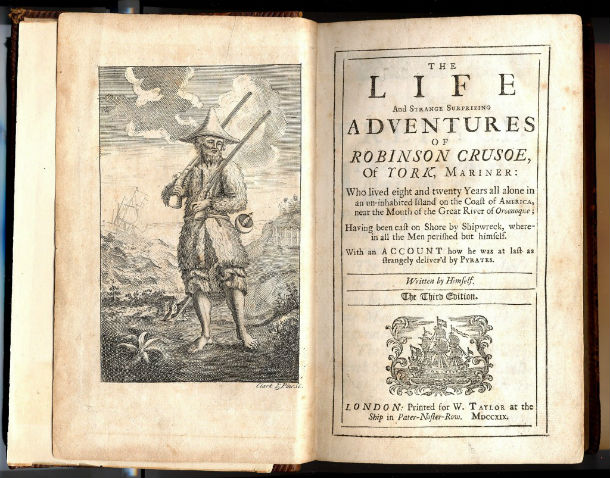 One of his titles keeps his name famous almost three centuries after he published it: “Robinson Crusoe.” Its full title on publication in 1719 was longer (ahem): “The Life and Strange Surprizing Adventures of Robinson Crusoe, Of York, Mariner: Who lived Eight and Twenty Years, all alone in an un-inhabited Island on the Coast of America, near the Mouth of the Great River of Oroonoque; Having been cast on Shore by Shipwreck, wherein all the Men perished but himself. With An Account how he was at last as strangely deliver’d by Pyrates.”