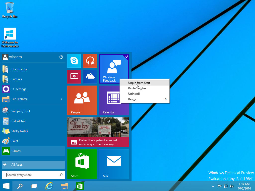 As with Windows 8, the tiles, which again represent apps, are easily edited, moved about, deleted (or “unpinned from start,” as it is phrased). I have the weather, a clock and calendar, and Netflix on mine. And something called Cortana. The start screen that Microsoft gives users upon download includes XBox controls and CandyCrush. Those are easily disappeared. Here is a screenshot from a 2014 article that depicts what I am explaining: