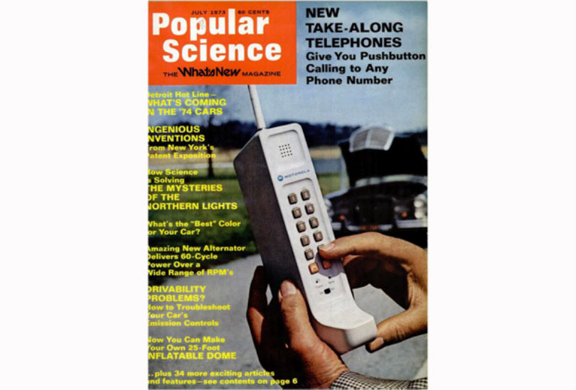 The moment was not recorded, but the event took place at a press conference, so Cooper is reported by many sources to have said to his competitor, “This is Marty. I’m calling you from a cell phone, a real handheld portable cell phone.” He was using an early version of the company’s DynaTAC mobile phone, which became commercially available and ubiquitous in the mid 1980s. The battery inside the two-and-a-half pound “brick” (seen above, on the cover of Popular Science from July that year) gave users 20 minutes of talk time and then needed to be charged for 10 hours.