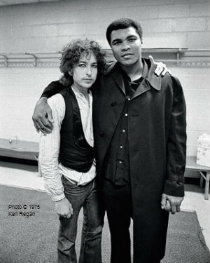 The photo at top is from the great photographer Ken Regan, who took it backstage at Madison Square Garden on December 8, 1975. Bob Dylan had brought his Rolling Thunder Revue to New York City and Ali joined the parade of well-wishers.
