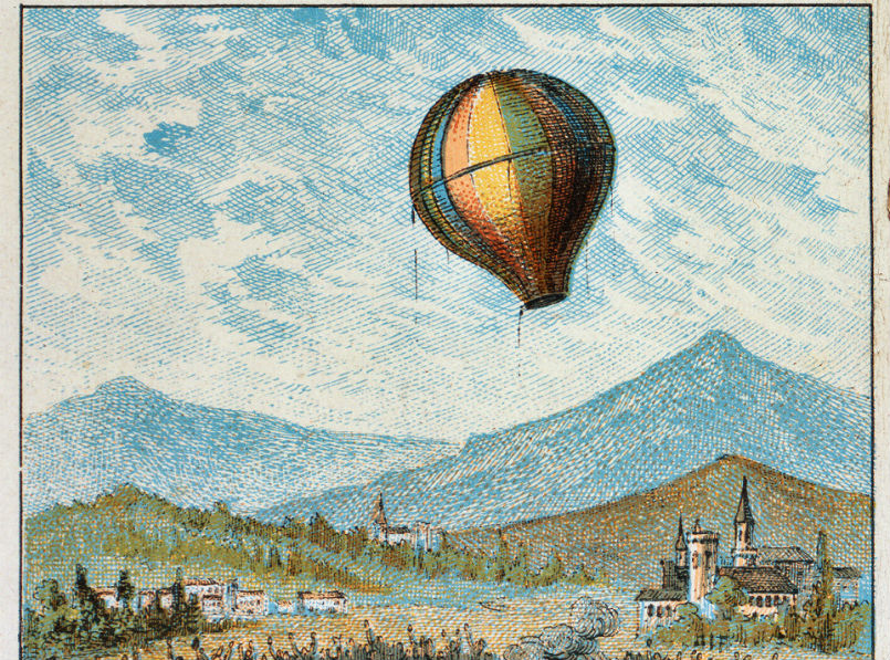 On this date in 1783, the Montgolfier brothers (Joseph-Michel and Jacques-Étienne) gave a public demonstration of their invention: the hot-air balloon. It was unmanned, flew for about ten minutes, and covered about a mile. (At top, floating above these words, is a contemporary depiction of the event.)