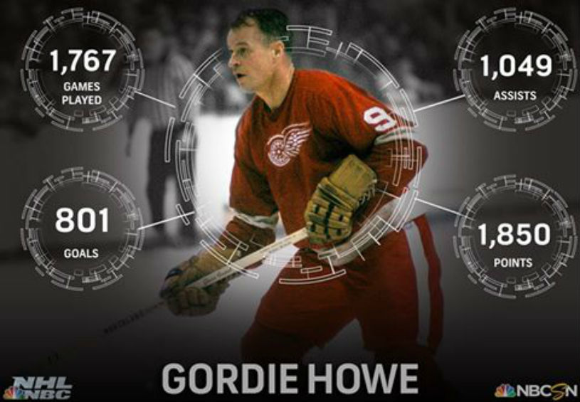In hockey, a “hat trick” is accomplished when a player scores three times in one game; a Gordie Howe hat trick is achieved when a player scores, records an assist, and gets into a fight on the ice. That about sums up the complete hockey player and it sums up Gordie Howe.