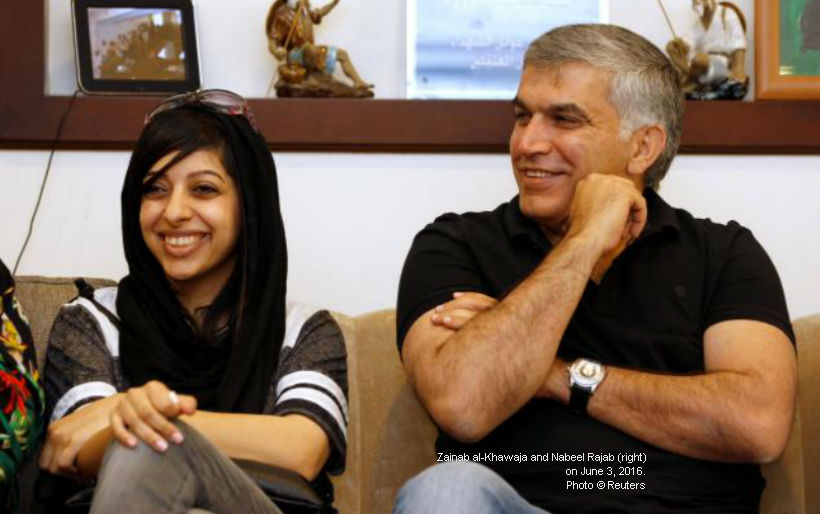 Indeed, the events of the past week—the forced exile of human rights activist Zainab Al-Khawaja (pictured at top last week with Rajab) and her two children, the travel ban imposed at the airport on the six activists, and Rajab’s arrest—make it appear that Bahrain has re-entered (if it ever left) a repressive phase. After Rajab was released in July 2015, a one-year travel ban was imposed on him. As we are still within that one year time period, Rajab was not attempting to travel to Geneva for the UNHCR sessions. He was arrested anyway.