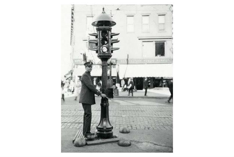 James Hoge is credited with the invention, which also used red and green signals, which had been standard “stop” and “go” colors for many years, and also employed a buzzer to warn when a change was coming up. It was manually controlled.