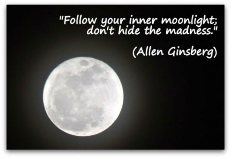 In his published works, Allen Ginsberg wrote not one single thing about moonlight and madness, yet there is a popular Internet meme—an Internet poster—usually seen with a handsome photo of our moon and the rousing declaration credited to him that you should “Follow your inner moonlight; don’t hide the madness.” (See above.)
