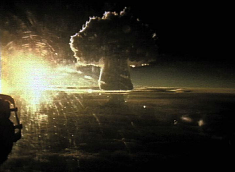 From 100 miles away, the crew of the Tu-95V plane found themselves looking up at the bottom of the mushroom cloud created by the bomb they had dropped several minutes before. After the crew dropped the bomb, the pilot flew the plane as fast as possible from the impending explosion: when the plane was twenty-eight miles away, the device detonated, and the shock wave traversed that distance almost instantaneously and knocked the plane a mile-and-a-half down and away. The crew safely landed the plane, but not before they took photos of Tsar Bomba’s mushroom cloud (above), the largest thermonuclear weapon—thus, the largest weapon—yet detonated on the planet.