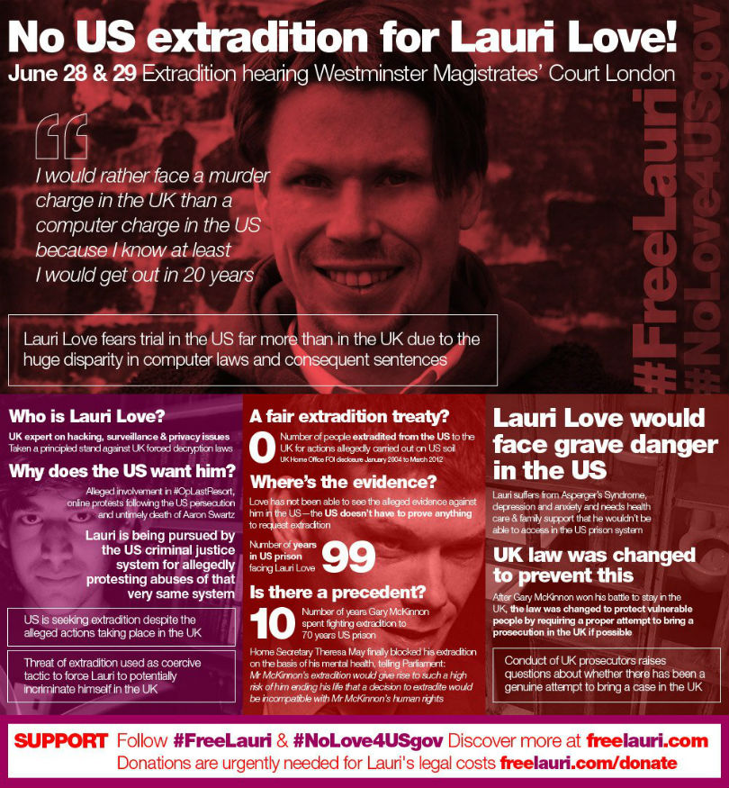 The Courage Foundation, which has been aiding Love in his legal fight for his life, estimates that if Love is sent to the U.S. to face the charges (the number of which remains unknown), and if he is “convicted of all charges and the sentences are served consecutively, he faces a maximum sentence of 99 years in jail in the United States.” An argument against sending him here on humanitarian grounds is being filed.