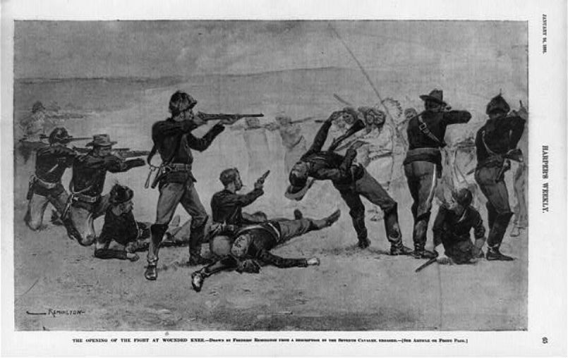 Frederic Remington’s image of the “fight” at Wounded Knee for Harper’s Weekly at top.