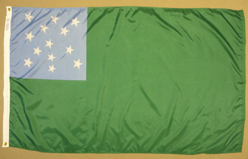 Between 1777 and statehood in 1791, Vermont was the Republic of Vermont, a sovereign entity that did not much want to be a republic (historians refer to it as the “reluctant republic”) but had a population that was only interested in joining a nation on its terms. It issued currency and had a flag, the “Green Mountain Boys Flag” seen at top.