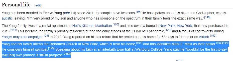 Further, none of the replies to my comment took up the part of the one-liner that I thought had been the point of the tweet: New Paltz. Mr. Yang lives part-time in my hometown of New Paltz, New York, and attends church at a church I set foot in more than once a week as a member of a certain club. When he ran for New York City Mayor last year, I used that same phrase in Tweets about him: “Andrew Yang of New Paltz.” (New Paltz has its own mayor and is sixty miles away from NYC.) A Yang for Mayor campaign worker messaged me that my repeated joke about New Paltz elicited laughs behind-the-scenes among his NYC staff.