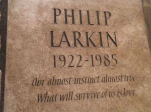 He was a major poet; thirty-seven years after his death, he is consistently ranked among the top ten post-war English writers by other writers. His name tops most contemporary polls as Britain’s favorite poet. Many of his lines live on in our hearts and memes: “Our almost-instinct almost true: / What will survive of us is love,” from “An Arundel Tomb” is quoted on his plaque in Poets’ Corner in Westminster Abbey: