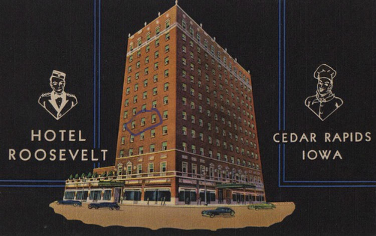 Below is a photo of the apartment building in which lived in that city. The Roosevelt was built in the 1920s (so it was named for Theodore) and was for a time one of Cedar Rapids’ two tallest buildings; twelve stories tall, it remains a part of the skyline. It began life as a ritzy hotel and it is now an apartment and office building. I have circled “my” three windows on the fifth floor; the middle window and one immediately to its right were my living room, and the window on the left was my bedroom window. There were corner apartments on either side. These are large windows, which is important to know for the anecdote; the windowsill was at mid-thigh height and the top of the windows was at the ceiling, and these apartments had 10-foot ceilings. Big windows.