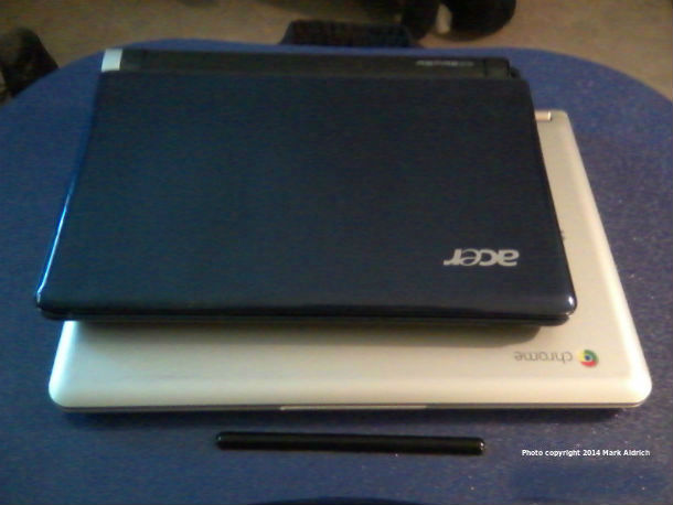 My writing implement superstition has reared its head in my life with computers, though, sad to say for my wallet. At this point, it would take me longer than you have available for me to recount the number of computers, laptops, and handhelds I have owned. (I loved the Treo 90 and owned a half-dozen over the years, some of which felt right and some of which did not.) Some computers I became attached to like a beloved typewriter, others were only employed to go online and make sure I was still alive when I discovered that typing on them just didn’t “feel right.” Four years ago I purchased a full-sized laptop on which I tried to write a book. Either the keyboard was built too sensitively or I typed on it like an orangutan, but it no longer produces the letter C. (One of the top 13 letters in our alphabet.) When the briefly popular Netbooks came out (the era lasted approximately six months in 2006), I bought the Acer seen at top. Upon learning that the full-size machine was resistant to writing, at least any words that needed the letter C, I returned to the Acer and discovered I was making more progress on that book project. It sat, happy to be employed, on top of the full-size laptop and became known as the “Little Guy.”