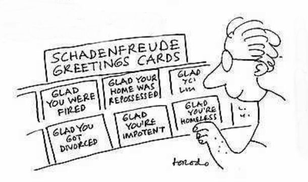 The term schadenfreude literally means damage-joy. When one enjoys the news that a rival is encountering trouble, one is experiencing a sense of schadenfreude. Most of us have experienced this feeling at some point in our lives, but most of us also have been jerks at some point in our lives, and the two sometimes come at the same time.
