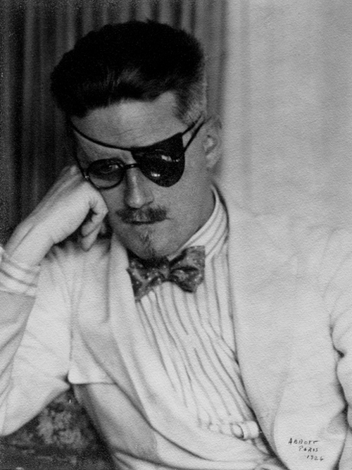 This is the James Joyce captured in Berenice Abbott’s famous portrait of the artist: At rest and a bit more confident in his world. The left lens in his eyeglasses is shaded, evidence of the ongoing battle to save his sight. It is one of the two or three most famous photos of the author, the one fondly parodied on the album cover for “If I Should Fall From Grace with God”: